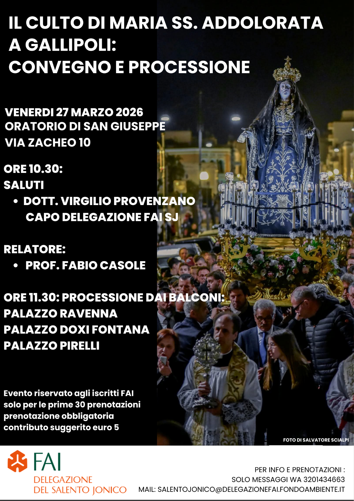 La Delegazione FAI Salento Jonico organizza solo per i suoi iscritti un iniziale momento culturale, un convegno sul culto della Madonna Addolorata a Gallipoli. L’incontro avrà inizio alle 10.30 nella Chiesetta di S. Giuseppe Picciccu, in Via Zacheo, nel centro storico di Gallipoli, non lontana dalla Chiesa del Carmine da dove partirà in seguito la processione. Il relatore dell’incontro sarà il Prof. Fabio Casole, docente dell’I.I.S.S.” A. Vespucci” di Gallipoli. Al termine dell‘incontro gli ospiti della Delegazione saranno accompagnati in alcuni storici Palazzi del Centro storico di Gallipoli dai cui balconi potranno assistere in modo privilegiato al passaggio della processione fino all’ingresso nella Concattedrale Gallipolina