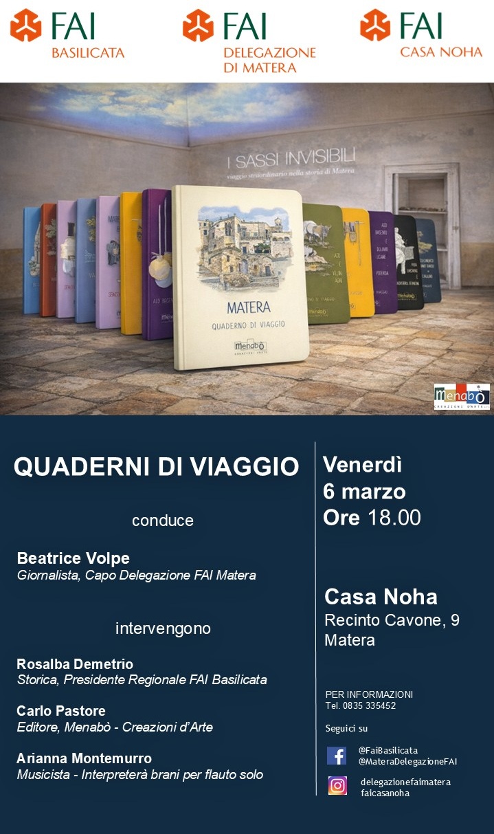 Conduce Beatrice Volpe, Giornalista, Capo Delegazione FAI di Matera. Intervengono: Rosalba Demetrio, Storica, Presidente Regionale FAI Basilicata, Carlo Pastore, Editore di Menabò - Creazioni d’Arte. Arianna Montemurro, Musicista, interpreterà brani per flauto solo.