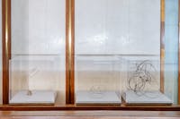 Nel dialogo tra la complessità del segno nell’opera del fondatore del movimento spazialista e la relazione tra spazio e corpo nel lavoro di uno tra i più acclamati e articolati scultori-ricercatori del nostro secolo si inserisce un terzo protagonista: l’architettura di Carlo Scarpa, che enfatizza e valorizza forme e colori delle opere in mostra, accuratamente inserite nello spazio disegnato e segnato, oltre che dalle linee, dalla luce e dai materiali, in una composizione rigorosa e armonica, la cui perfezione fa del Negozio Olivetti un’opera d’arte in sé e un’icona del Novecento. L’architettura, del resto, per Antony Gormley è il «banco di prova più efficace e potente per la scultura», per esprimere la sua idea del corpo, esso stesso architettura, contenitore sensibile ed elemento di espansione nello spazio; anche per Lucio Fontana l’architettura è l’elemento necessario da cui partire per raggiungere in modo percettivo e soprattutto concettuale una dimensione ulteriore, che non si limita all’oggetto opera, ma supera le linee meccaniche e il tempo meccanico per conquistare, attraverso il gesto dello scolpire, una dimensione di “eternità”.