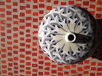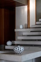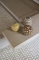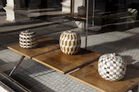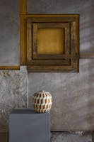 Dal paesaggio e dalla tradizione così come dalla grandiosità dell’arte e dell’architettura veneziane, sia Scarpa che Micheluzzi apprendono a esercitare l’occhio ai dettagli senza perdere la visione d’insieme: la città di Venezia. Ciò è evidente al Negozio Olivetti, progettato nell’estremo dettaglio, ma come un sistema unico e soprattutto integrato con la città, verso cui si apre, attraverso la trasparenza delle grandi vetrate e originali punti di vista sulla piazza, di cui diviene esso stesso una parte. Questo incrocio o crosera di piazza è l’emblema di uno scambio su più livelli: da quello tra interno ed esterno a quello delle linee, delle forme, dei colori e dei materiali, che ripropongono e reinterpretano elementi tipici e simbolici della città. Il senso della collezione, e dell’esposizione, non sta nella riproposizione dei moduli scarpiani e non è un omaggio all’architetto, ma è il racconto della condivisione delle medesime radici: su tutte, quella passione per il bizantino che li ha allenati al gioco di luci, ai silenzi e naturalmente al mosaico. Quello stesso sistema di tessere, che si ritrova nello straordinario pavimento del Negozio Olivetti, moderna interpretazione del terrazzo veneziano: gli elementi cromatici del pavimento sono incastonati nella superficie con un rigore che, ben lontano dall’essere ordine meccanico, lascia spazio a quelle minime variazioni di nuance e movimento che fanno vivere e vibrare il suolo stesso, secondo i medesimi principî che si rintracciano nei vasi di Massimo Micheluzzi.