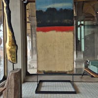 Prima disegnatore, poi pittore, illustratore, incisore, grafico, Mattioli sul finire degli anni Settanta chiude la stagione dei ritratti, e mentre inaugura la mostra al Negozio Olivetti, inizia a lavorare sulla serie delle Aigues Mortes e delle Ginestre, tra le protagoniste di questa esposizione, che raccoglie una selezione di ventisette opere realizzate dalla fine degli anni Settanta ai primi anni Novanta, che testimoniano una fase della ricerca dell’artista caratterizzata da una sensibilità nuova e vibrante verso la materia e il colore. Il percorso espositivo prova a instaurare un dialogo ideale con il luogo: attraverso l’uso sapiente del legno, in cui si incontrano architettura, scultura e pittura, o della iuta e del vetro, fuso a Murano, la mostra instaura un gioco di rimandi, nelle superfici e nei materiali, che omaggia non solo la lezione scarpiana ma anche Venezia, i colori e le atmosfere della laguna.