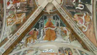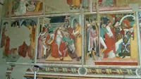 Il primo restauro tra 1935 e 1936 fu piuttosto una prova per restituire più o meno rigorosamente una certa leggibilità al ciclo già notevolmente lacunoso. Dato che gli affreschi si trovavano in uno stato di totale abbondono, all’inizio degli anni Cinquanta è stato iniziato un altro restauro per eliminare le reintegrazioni incongrue. Poi nel 1959 la Soprintendenza decise di restaurarli con la tecnica dello strappo. Alcuni pannelli furono riconsegnati al paese nell’anno 1966 per essere esposti nella parrocchiale di San Michele. Nel 1976 un intervento globale sul ciclo finalizzato alla sua definitiva ricollocazione nella chiesa di San Bernardo è stato affidato al laboratorio pisano di Walter Benelli. Un primo lotto di lavori (gli Evangelisti e i Dottori della Chiesa delle due volte) sistemati su moderni supporti semi rigidi in vetroresina vengono ritrasferiti sulle volte della chiesa; agli inizi degli anni Ottanta un paziente lavoro di conservazione e restauro continuerà fino al 1996, procedendo per piccoli lotti. La chiesa è stata riaperta ufficialmente il 5 aprile 1998.