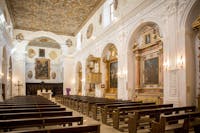 L’interno, a pianta basilicata, presenta arconi laterali a destra ed ampie cappelle nella navata minore sinistra; conserva quasi intatta la decorazione barocca, articolata in ricchissimi piani ornati da stucchi, intagli e dipinti.