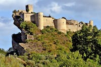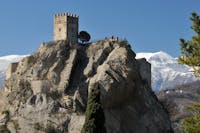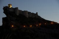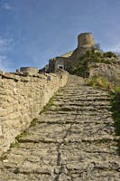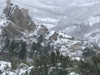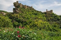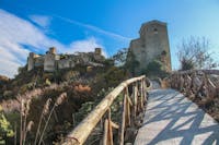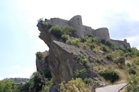 Dal cuore del piccolo paese, una ripida e contorta gradinata conduce alle mura della rocca e si apre sul vano che ospitava il ponte levatoio; i torrioni circolari che la difendevano sul lato scoperto dello sperone verso valle sono ancora tutti visitabili con le carceri, i forni e riproduzioni di armi da fuoco d’epoca; dopo l’ultima torre, quella Angioina, nel punto più alto e più impervio dello sperone svetta la torretta d’avvistamento, organismo a tre piani, con solai in travatura in legno, e un ingresso ad arco acuto con diverse incisioni sulle pietre da costruzione.