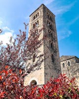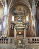 Sulla facciata ad est si aprono tre ingressi. La parte occidentale dell'edificio presenta invece tre absidi e una scalinata. Il campanile, alto 30 metri e in stile romanico, presenta monofore, bifore e trifore.