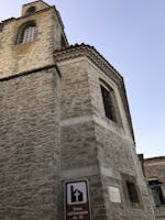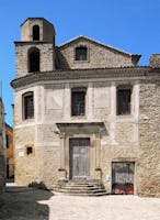 L’edificio religioso ha la facciata a terminazione rettilinea in pietra arenaria locale a conci irregolari che si apprezza per l’equilibrio compositivo degli elementi che la connotano: le tre aperture del registro superiore inframezzate da due orologi solari riquadrate da fasce di intonaco chiaro; il cornicione di coronamento con le sue romanelle di coppi e laterizi e la sottostante fascia con finitura ad intonaco rustico, un tempo decorata con elementi geometrici monocromatici; il portale cinquecentesco in pietra calcarea incisa e scolpita, inquadrato lateralmente da paraste poggianti su alti piedistalli e capitelli compositi, sui quali poggia la trabeazione.