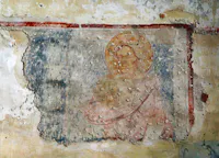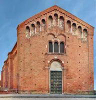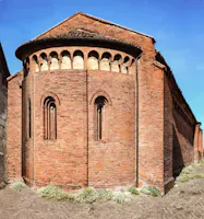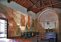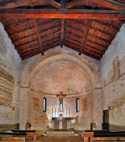 Il portale è dotato di un arco in mattoni alternati a conci di pietra bianca, al di sopra del quale si apre una trifora, provvista di capitelli di reimpiego risalenti al IX-X secolo. Internamente la Chiesa si presenta ad aula unica absidata e nel catino dell’abside conserva resti di affreschi databili ai primi decenni del XIII secolo che rappresentavano l’Incoronazione di Cristo e della Vergine. Sono rimaste soltanto alcune parti di questi affreschi romanici di notevole interesse. Tre finestre strette lasciano entrare la luce per illuminare l’abside. Tali affreschi non sono le uniche testimonianze pittoriche presenti all’interno della chiesa: nella parete sud vi è un dipinto votivo raffigurante la figura di Cristo di gusto rinascimentale, mentre al 1847 risalgono le targhe affrescate lungo entrambi i muri dell’edificio con iscrizioni riferite ai ministri commendatari dell’ente.