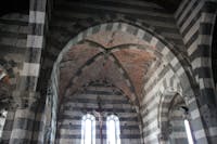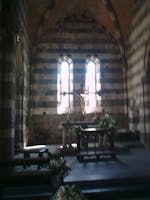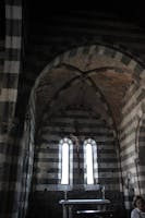 Entrando nella piccola chiesa si ha la sensazione di trovarsi in un unico ambiente, ma ad uno sguardo più attento si può riconoscere la divisione in tre navate, le laterali più strette e la centrale più ampia che conduce lo sguardo all’altare in marmo bianco di semplice fattura. L’interno della chiesa è decorato, come parte della facciata, a strisce orizzontali bianche e nere; al presbiterio sono affiancate due piccole cappelle laterali a pianta quadrata con copertura a volte ogivali, quella a sinistra è sormontata dalla torre campanaria che sale a sezione quadrata sino a chiudersi a piramide e decorata, su ogni lato, da due file verticali di bifore che, oltre ad avere una funzione decorativa, hanno il compito di alleggerire la struttura della torre.