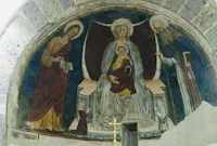 Nella calotta absidale,l’affresco, frontale e maggiore, sono rappresentati, la Madonna in trono con il Figlio sulle ginocchia, tra i santi Giovanni Evangelista, a destra, e un barbuto sant’Antonio abate, a sinistra, mentre ai loro piedi, e non a caso, si notano le figure dei devoti committenti e una dicitura reci tante della volontà manifestata per la fattura dell’opera e della loro devozione.