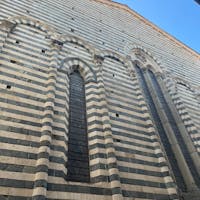 L'edificio si presenta regolarmente orientato, col lato settentrionale, parallelo alle scomparse mura, in grande evidenza mentre il lato meridionale dà sul chiostro, e facciata e lato absidale sono malamente visibili, a causa degli edifici che quasi toccano la fabbrica. Il fianco nord, di conseguenza, è stato sempre considerato la vera facciata e infatti reca al centro il ricco portale con l'architrave scolpita e firmata dal maestro Gruamonte che vi raffigurò l'Ultima Cena (datato 1166). La fiancata presenta un'ornamentazione caratteristica del romanico a Pistoia, che imita il paramento murario tipico del romanico pisano, a file di arcatelle su lesene o colonnette con finestrelle e losanghe che si inscrivono negli archi, ma realizzata impiegando una decorazione dicroma bianca e verde (marmo e serpentino di Prato) che diventa così fitta da sovrastare otticamente il pur complesso partito architettonico.