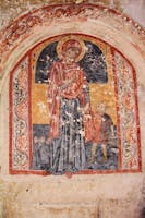 L’iconografia è molto varia e presuppone epoche diversi. Il ricco corredo di dipinti di notevole qualità si sviluppa su tutte le pareti, ma soprattutto segnaliamo la Madonna Orante con Bambino con iscrizione greca e la Madonna con Bambino nel vano centrale e la Presentazione al Tempio, comunemente detta “la Candelora”, da cui ha preso il nome la cappella. In questo dipinto, la Vergine e il Bambino sono indicati da iscrizioni in greco, il San Simeone, invece, da iscrizione latina. All’interno e fuori l’archeggiatura si osserva una ricca fascia decorativa, simile a quelle delle immagini dei SS. Medici della prospiciente cripta di San Marco. In alto, sul lato sinistro dell’estradosso dell’arco, si osserva, graffito, l’anno 1576.
