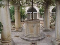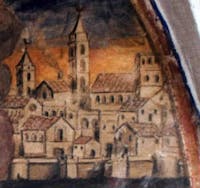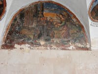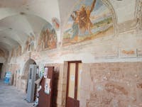 Il chiostro appartiene al convento presso la chiesa di Santa Maria Vetere la cui esistenza è documentata già nel 1398 e in esso nel 1419 fu tumulata Antonia Brunfort moglie di Guglielmo Del Balzo.Tuttavia non si conosce la data certa della sua edificazione. Il convento era un convento dei Frati Minori Osservanti, uno dei più importanti della provincia monastica di San Nicola ; in esso vi dimorava il Ministro provinciale, con una scuola di teologia. Il chiostro attiguo riporta la data 1567, data che però potrebbe riferirsi solo ad un rifacimento piuttosto che all'epoca di edificazione. Esso presenta dipinte sulle lunette delle pareti le storie e la vita di San Francesco e a completamento una serie di tondi con l' immagine di un santo o di un martire o di un terziario francescano. Gli autori provengono dalla famiglia francescana. È l' unico chiostro affrescato andriese rimasto ma il cogente degrado e la costante minaccia di deterioramento progressivo potrebbero determinarne la definitiva scomparsa.