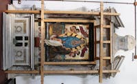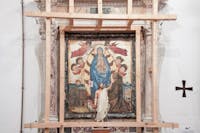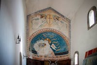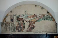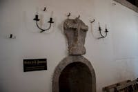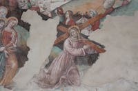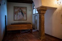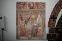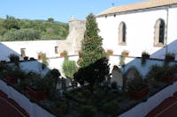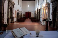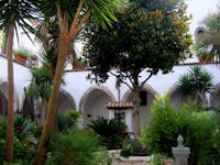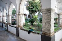 1. Il chiostro del convento e gli ambienti che lo circondano sono stati oggetto di profondi restauri durante gli anni Cinquanta del Novecento. Diversi ambienti al piano superiore crollati o pericolanti furono ricostruiti, come la cappella di San Francesco, che fu ampliata rispetto a quella originaria. Il chiostro è a pianta quadrangolare, con un corridoio per lato, che si apre sul cortile centrale tramite cinque arcate ogivali. Le campate sono coperte con crociere a sesto acuto. Osservando le colonne che reggono le arcate del quadriportico si notano due fasi costruttive. Quella originaria, coeva alla chiesa, ascrivibile al periodo angioino, costituita dai lati che costeggiano la chiesa e la parte orientale del convento. In questa porzione le arcate sono sostenute da pilastri polistili in pietra di tufo grigio, con capitelli che presentano decorazioni che rievocano elementi naturali. Laltra, di epoca successiva, probabilmente frutto di una ricostruzione di quella parte crollata, presenta arcate sostenute da pilastri ottagonali in pietra di piperno, con le teste identiche alle basi. Su due lati del chiostro si aprono diversi ambienti, un tempo tutti con specifiche funzioni.