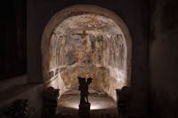 L'oratorio ha una volta a botte dipinta con un cielo stellato. Le pareti sono ricoperte da affreschi di un certo Sant'Onofrio risalenti verosimilmente al XIII secolo. Sul fondo è raffigurata la crocifissione e ai lati la Madonna e San Giovanni; nella lunetta sovrastante è visibile la Vergine in trono con Bambino e in quella di fronte San Benedetto, San Mauro e Sant'Antonio Abate. Sulla parete di sinistra, un altro affresco del XIV secolo raffigura Pietro nelle vesti di Pontefice. Attraverso un corridoio si accede alle cellette dei monaci e in una nicchia affrescata è visibile una Crocifissione con due coppie di Santi tra cui San Pietro Celestino. Sottostante la chiesa vi è una piccola grotta con il giaciglio di Pietro scavato nella roccia. La tradizione popolare chiama questo luogo "culla di Sant'Onofrio" e il coricarsi su questa pietra aiuterebbe a guarire i dolori.