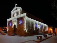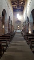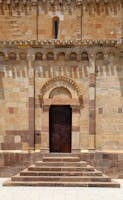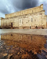 La chiesa di Santa Maria venne eretta in stile romanico pisano tra il 1213 e il 1282, secondo quanto testimoniano le due epigrafi apposte in occasione dell'inizio e della conclusione dei lavori, ancora conservate all'interno del tempio. Nella prima metà del XIII secolo Tratalias, all'epoca fiorente borgo, divenne sede della diocesi sulcitana, qui traslata da Sant'Antioco. Santa Maria fu quindi cattedrale sino al 1503, anno in cui Iglesias divenne sede vescovile. L'attuale intitolazione alla Madonna di Monserrato risale all'epoca della dominazione catalano-aragonese. Abside:La chiesa sorge al centro di quel che rimane dell'antico villaggio che costituiva l'abitato di Tratalias, prima di essere abbandonato nella seconda metà del XX secolo, in seguito alle infiltrazioni d'acqua e i cedimenti del terreno successivi alla formazione dell'invaso artificiale di Monte Pranu, e rifondato poco distante. Gli edifici del borgo vengono attualmente riqualificati a scopo turistico. L'ex cattedrale è l'unico edificio superstite della medievale Tatalia. L'edificio, in calcare e trachite, si basa su un alto zoccolo in cui si innestano le paraste angolari e le lesene che ne scandiscono esternamente i lati. La facciata è divisa in due ordini. La zona inferiore è tripartita e presenta gli specchi laterali lisci, decorati solo da una losanga, mentre al centro si trova il portale, architravato e sormontato da un arco a tutto sesto con ghiera decorata a motivi vegetali. Nell'ordine superiore si apre il rosone, dall'oculo polilobato. Il timpano sopra il secondo ordine presenta un'apertura da cui partono alcuni gradini che dall'interno della chiesa consentono di raggiungere il tetto. Sia la facciata che le pareti laterali sono decorati da archetti pensili, i quali poggiano su peducci scolpiti. Il portale laterale del prospetto sud è simile a quello in facciata, mentre il portale a nord è sormontato da un arco ogivale. Retablo: L'interno è a pianta rettangolare, diviso in tre navate da pilastri e arcate a tutto sesto, con abside semicircolare orientata. La copertura delle navate è a capriate lignee. La luce penetra tramite le diverse monofore laterali, dal rosone in facciata e dalla bifora ad archi ogivali aperta sopra l'abside. Nella navata sinistra si trova un piccolo retablo cinquecentesco.