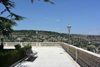 Sorge su uno sperone di roccia che si affaccia sulla vallata dell'Irminio, all'estremità est dell'abitato a circa 385 m s.l.m.; l'ingresso è costituito da un magnifico viale fiancheggiato da numerose palme, è assai ben curato e adornato con panchine ben scolpite, colonne con vasi in pietra scolpiti in forme diverse e una elegante balconata con recinzione in calcare. Imponente al centro della villa il monumento ai caduti della grande guerra. All'interno si trovano la chiesa di San Vincenzo Ferreri, la chiesa di San Giacomo e la chiesa dei Cappuccini. Vicino al giardino, si trovano pure gli scavi archeologici di Ragusa Ibla