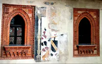 La facciata del Palazzo del Podestà presenta cinque finestre a sesto acuto, diseguali tra loro e contornate da decorazioni in terracotta, mentre sull'intero muro, intonacato e dipinto, sono stati rilevati, nonostante il degrado dell'intonaco e delle decorazioni, i vari stemmi dei podestà che si sono succeduti nel corso degli anni: affreschi che intervallavano le monofore, di cui cinquecentesca è la porzione adiacente al lato destro della prima finestra contente lo stemma della famiglia Arcimboldi.
