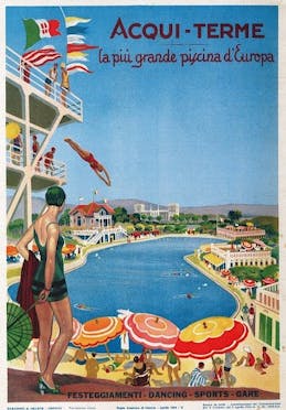 A Mario Bacciocchi, più conosciuto come “l’architetto dei grattacieli” che nel dopoguerra progettò e realizzò – per conto dell’ENI su mandato di Enrico Mattei – gran parte degli edifici di Metanopoli a San Donato Milanese, venne affidato nel 1940 l’incarico per la Lavanderia delle Terme.La volumetria si presenta compatta e unitaria, con la presenza di ampi loggiati sulle testate al primo piano ed è chiaramente improntata al linguaggio moderno del funzionalismo internazionale