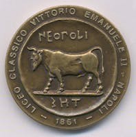 Quando nell’aprile del 1990 il più antico Liceo della Polonia,il “Bartlomiya Nowodworskiego” di Cracovia, si legò in gemellaggio con il nostro Liceo,agli studenti e ai professori polacchi fu donata una medaglia per celebrare l’evento e ricordare le antiche radici culturali del liceo napoletano, nonché l’amore per gli studi classici che accomunava entrambe le scuole, seppure nella diversità delle tradizioni storiche, culturali e sociali dei rispettivi paesi. L’idea di una medaglia che divenisse l’emblema del Vittorio Emanuele era nata all’indomani delle celebrazioni del 125° anniversario della fondazione del Liceo, sulla spinta delle emozioni e degli entusiasmi suscitati da quella straordinaria occasione. Occorreva scegliere un’immagine identificativa della scuola, che fosse simbolica e nello stesso tempo originale: operazione non semplice, che poteva rivelarsi occasionale, ovvia, nel caso la scelta fosse stata affrettata e convenzionale, considerato il vasto repertorio di modelli più o meno stereotipi adottati da numerose istituzioni culturali (colonne, capitelli, portali, elementi architettonici o figurativi , monogrammi, spesso chiosati o integrati da un motto ). Prevalse così l’idea di collegare simbolicamente, con una sorta di “sincretismo” di matrice umanistica, il più antico liceo classico di Napoli con una delle più antiche monete neapolitane, individuando nella figura del toro dal volto umano, caratteristica costante di tutta la monetazione di Neapolis fino alla sua fine, l’effigie da scegliere come emblema del Liceo. L’immagine appartiene al rovescio di un didrammo della fine del V secolo a.C. e raffigura il dio fluviale Acheloo, uno dei favolosi esseri zoomorfi della mitologia greca - un Minotauro al contrario - considerato il padre delle Sirene, e quindi della sirena Partenope, eponima del primo nucleo abitativo della città. Il valore storico e documentario della leggenda, che fa riferimento alla nuova comunità, ovvero agli abitanti della nuova città ( Neopoli-tes )con l’iscrizione destrorsa Neopoli, in alto, sulla figura del toro e quella retrograda thV , in basso, al di sotto della doppia linea di esergo, secondo le consuetudini di scrittura delle colonie ioniche dell’Eubea, giustificava questa scelta particolare, ritenendola idonea per segnalare una scuola superiore di indirizzo classico. Fu così che nacque l'emblema del Liceo, non senza uno sprizzo di vis polemica di alcune docenti che vedevano nell'immagine taurina soltanto un archetipo maschilista, con una lettura evidentemente distorta di figure e simboli della nostra storia mitica. Riprodotta fedelmente, con un disegno che rappresenta in forma stilizzata l’originale conservato al Museo Archeologico di Napoli, la figura del toro Acheloo, grazie ai contributi del prof. Enrico Calamaro e del maestro Angelo Taborelli, è divenuta l’immagine - simbolo del Liceo. Un richiamo dotto, dunque, di carattere etiologico, iconograficamente intenso, che evoca le origini mitiche di Neapolis e ci riporta alle prestigiose tradizioni umanistiche della cultura napoletana e del Vittorio Emanuele, il primo “liceo municipale”, fondato nel 1861, nell'antica strada San Sebastiano..