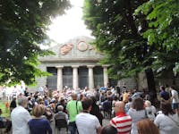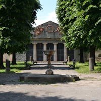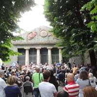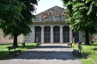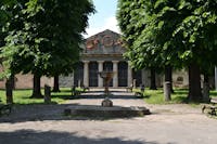A costituire il fondale monumentale di Piazza San Francesco si trova il Parterre, una vasta piattaforma a verde, rialzata, che culmina con un edificio dedicato alla memoria degli Uomini Illustri di Pistoia. Il disegno del suo impaginato, dovuto al Cavaliere Cosimo Rossi Melocchi, possiede connotati ispirati all’architettura del periodo illuminista di matrice francese. La facciata è rigorosa, simmetrica, scandita in lunghezza da nicchie a quarto di sfera. Un portico timpanato evidenzia l’accesso all’ambiente principale del Pantheon, un ambiente ad emiciclo segnalato anche da due raffigurazioni scultoree della Fama che affiancano lo stemma cittadino. La funzione celebrativa del manufatto architettonico si palesa, poi, nelle decorazioni pittoriche all’interno, affidate al pittore locale Bartolomeo Valiani: nella volta sono presenti affreschi di festoni sorretti da figure alate, lire e tube romane con ghirlande. La narrazione degli episodi legati agli uomini illustri è realizzata con la tecnica della grisaille: tra queste raffigurazioni trova posto anche la celebrazione di una donna, tale Maria Maddalena Morelli, poetessa arcadica conosciuta con lo pseudonimo di Corilla Olimpica. Nonostante l’edificio si proponesse di celebrare le glorie civiche di Pistoia, esso assume ben presto una destinazione d’uso diversa da quella originaria, ospitando inizialmente un elegante Caffè Musicale che riscuote un ottimo successo tra i cittadini. Con la sua attività l’associazione Filarmonica Pietro Borgognoni, che ha sede negli ambienti adiacenti dal 1813, si impegna da tempo affinché questo moderno tempio possa essere restituito al pubblico.