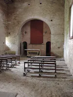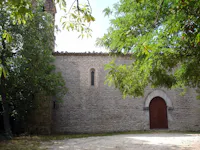 Qui i filari di conci in calcare rosato scuriti dal tempo mostrano e fanno supporre lo sviluppo orizzontale a rettangolo perfetto della lunghissima chiesa, ribassata ad est per l’abside . Si vede subito, sulla parete occidentale, il portale ad arco ogivale in pietra levigata, una monofora trilobata a strombo, una feritoia….