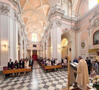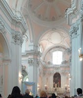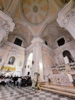 L’interno, a croce latina a tre navate, presenta decorazioni a stucco ricche di motivi floreali e rocaille, che al di sopra delle nicchie assumono la foggia di baldacchini barocchi.