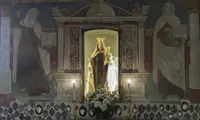 All’interno del Santuario si possono ammirare numerosi affreschi che rappresentano l’elemento artistico di maggior interesse, come l’Annunciazione che campeggia nell'abside, quelli della “Cappella dei Santi” e della “Cappella della Trinità”, che prendono il nome dall’affresco più significativo che in esse si trova. All’interno di una cornice che richiama l’architettura classica appaiono quattro figure, ritratte con sapiente grazia compositiva e gradevoli accostamenti cromatici. Vale la pena soffermarsi anche presso la figura del Cristo morto, che richiama lo stile del grande Mantegna. Si può trovare anche il particolarissimo affresco monocromo della Crocifissione, opera del frate Carmelitano Giovanni da Brescia; le figure qui disegnate in bianco sembrano quasi incise sullo sfondo verde e danno vita a una pittura al negativo.