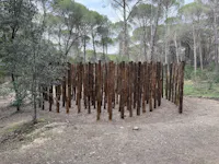 La geometria diventa un segno discreto che accompagna l’esperienza del bosco, senza invaderla né sovrapporsi al paesaggio, lasciando che siano la luce, il silenzio e la materia del bosco a completare l’esperienza. L’opera è un intervento misurato, capace di trasformare la permanenza nel bosco in un momento di quiete e consapevolezza.