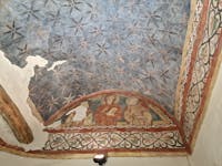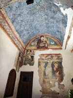 La piccola abside della chiesa conserva le testimonianze artistiche più importanti, con alcune scene affrescate nel Duecento: la parete alle spalle dell’altare mostra la Crocifissione con la Vergine e San Giovanni Evangelista. Il pathos della scena è accentuato dalle espressioni dolenti dei personaggi e dai due angeli intenti a operare una curiosa sostituzione della corona di spine con una corona reale. La drammaticità della scena si stempera nella lunetta soprastante, che raffigura una “Madonna della tenerezza”: nonostante il contesto sia nobile, con la Vergine seduta sul trono, i gesti mostrano la familiarità di una madre che tiene in braccio il figlio inclinando il viso verso di lui, che glielo accarezza con dolcezza.