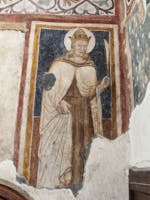 L’intervento ha portato a un’importante scoperta: sono infatti emerse con la pulitura, a sinistra della Crocifissione, le figure di un santo ignoto e, all’interno di una cornice polilobata, di un Cristo benedicente a mezzo busto. Entrambe le immagini sono successive al ciclo affrescato duecentesco e riferibili, così come la rappresentazione di san Pietro Celestino con la tiara papale e il mantello sopra al saio, che le affianca, al XV secolo.