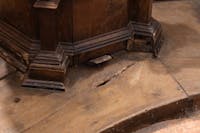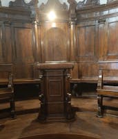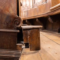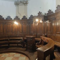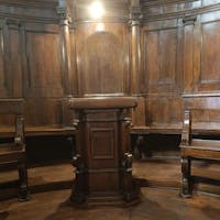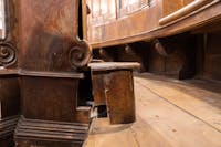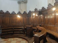 Nel 1769, al termine di un generale rifacimento, la chiesa viene riconsacrata e in questa occasione il Vescovo Speroni annota tra i lavori eseguiti la realizzazione di nuovi altari e la ricostruzione di presbiterio e coro. È proprio a quest’epoca che possiamo far risalire il manufatto. Ospitato nell’abside alle spalle dall’altare maggiore il coro – realizzato in legno di noce, presumibilmente da maestranze locali – è addossato alla parete, di cui segue l’andamento semicircolare. È composto da dodici sedute, i cosiddetti ‘stalli’, al cui centro si trova un seggio più grande e decorato. Davanti a questa struttura principale due banchi dalla medesima linea curva costituiscono altre sedute, oltre a svolgere le funzioni di leggii per i cantori dei dodici stalli. L’intero arredo poggia su pedane rialzate. Un coro molto caro alla comunità, che ne auspicava il recupero e che per ben due volte lo ha votato al Censimento “I Luoghi del Cuore”: oltre 1.000 voti alla decima edizione, triplicati nel 2022, in occasione dell’undicesima edizione. Grazie all’impegno dei componenti della corale, delle associazioni locali e di numerosi compaesani, il bene si è posizionato al 99° posto della classifica nazionale e ha potuto così accedere alla seconda fase del programma: il bando riservato ai luoghi che raggiungono i 2.500 voti e che permette di candidare progetti di restauro e valorizzazione al sostegno di FAI e Intesa Sanpaolo.