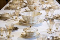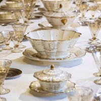 The tableware on display, from a private collection (courtesy Saverio Di Giaimo, Napoli), made of glazed ceramic, model 'Monza 16' with the '1170' decoration, consists of a soup tureen, three bowls, six terrines, four ladles, thirty-two serving plates, twenty-three small cups, sixty-nine knife plates, twenty-three soup plates and seventy-two fruit plates. At Villa Necchi, the table is set for 12, alongside silver cutlery and Murano glass glasses with gold rims and geometric decorations from the household service. The table will also be set with an elegant Flanders tablecloth belonging to the Necchi family and a large centrepiece decorated with flowers and leaves from the Villa's garden.