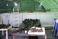 Lo scafo inizialmente è stato collocato in una grande vasca all’interno di una tensostruttura, dove è stato effettuato il processo di desalinizzazione propedeutico al trattamento conservativo. In fase di studio e restauro anche il materiale recuperato all’interno dello scafo, che ha consentito di datare la nave oneraria al II sec. d.C.