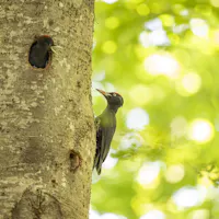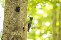 Imponente e inconfondibile è anche il picchio nero, il più grande picchio europeo: il suo tamburellare potente e ritmico sui tronchi può essere udito a grande distanza. Con il suo becco robusto scava profonde cavità negli alberi maturi, che in seguito diventano rifugio per molte altre specie, contribuendo così alla vitalità dell’ecosistema forestale